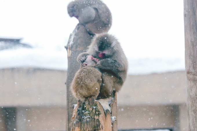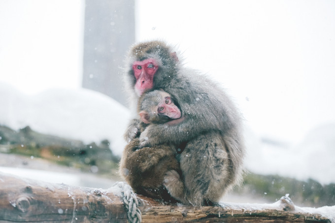 最让人动人的一幕是雪地里猴妈妈怀抱着猴宝宝取暖,雪中冻地通红的小脸,让人感受浓浓的温暖。