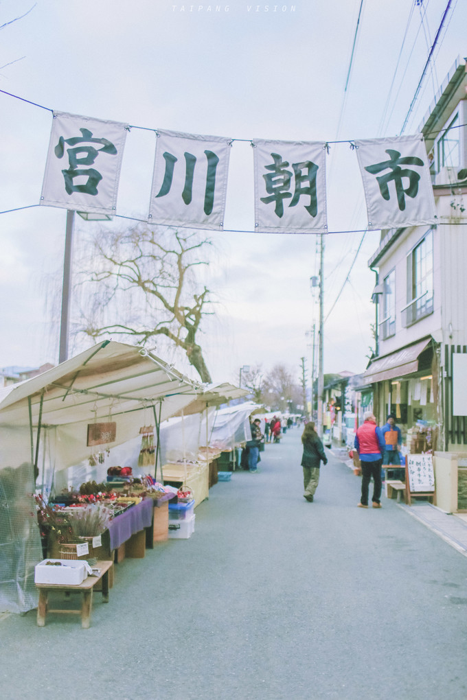 也是一条河贯穿的古老城市,像鸭川也像白川,让整个老城显得格外灵动,沿着河边一路走到了宫川朝市,区别于街上大多数未营业状态的店铺,这里的店主却纷纷忙碌地做着开店的准备并互道早安,新奇地逛上一圈,贩卖的大致是新鮮的蔬果、花卉、特色纪念品等小商品。