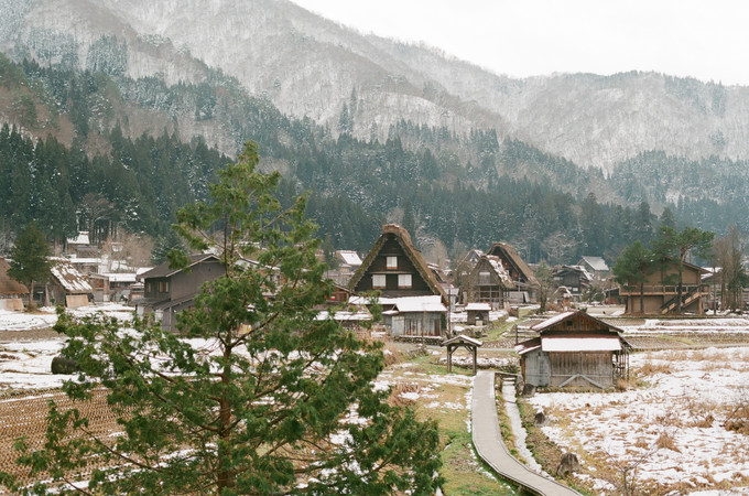 到点乘车前往白川乡,五十分钟的路程,一觉醒来是周围一片雪白,走过栈桥的对面就是期待中的姜饼屋村庄。