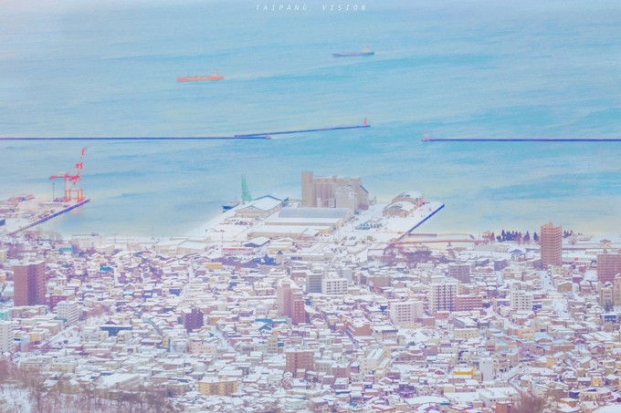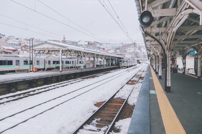 小樽离札幌只有半个多小时的火车车程,是一个临山靠海的小渔村。站在驾驶室旁边看风景,火车开出去不久穿过一个山洞后眼前便豁然开朗,铁轨被皑皑白雪覆盖,右手边是蔚蓝的大海。白雪覆盖的沿海铁路,总是有一种说不出的浪漫。