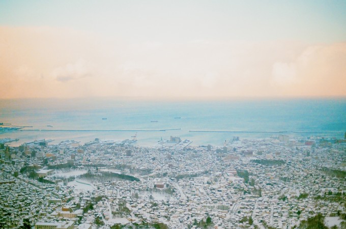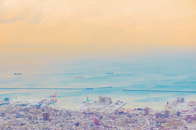 吃了午饭再一次坐火车来到小樽,直接坐缆车去到天狗山。运气不错,到了四点钟的时候雪也停了,云层开始散开,可以忘得见远处的海平面和湖蓝色的天空,像极了二次元的色调,明快清新。