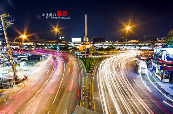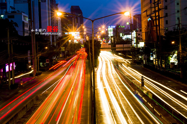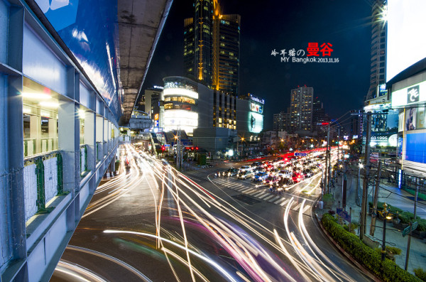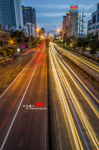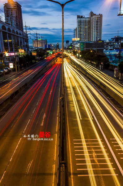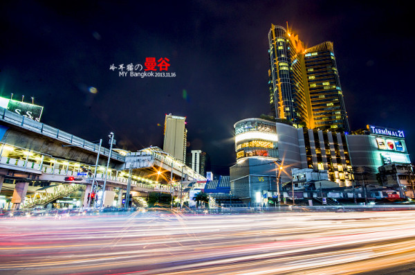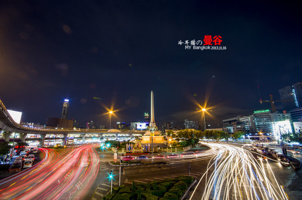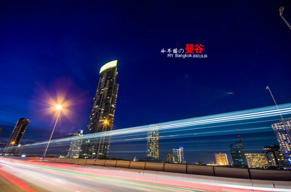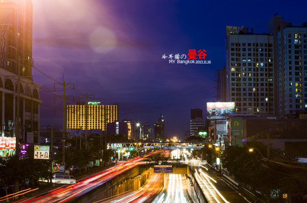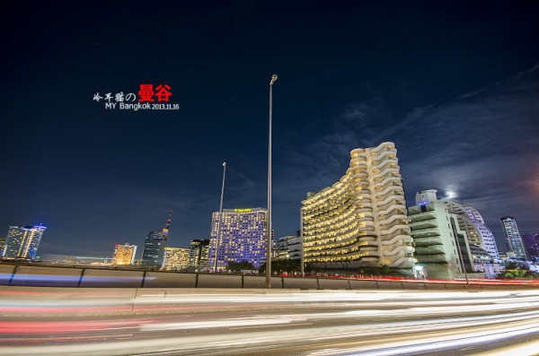 夜色中,扛着脚架在曼谷的大街小巷中瞎传,不可否认,曼谷的夜景的确是非常的漂亮,为什么呢,因为这里的空气透明度非常的高。所以就算很远很远的地方都能拍的很清晰,这一点成都是没法比的,在大多数时候成都的空气能见度有一两公里都很不错了。平时基本上都是雾蒙蒙的一片。还有就是曼谷的车流量都非常大。用慢快门曝光的话,很容易曝光出很漂亮的车流线来。给人感觉非常的现代和大气。