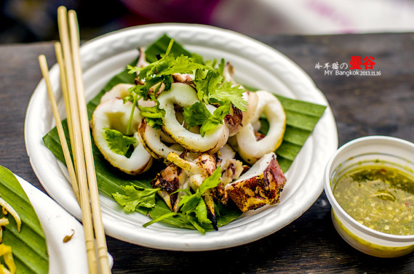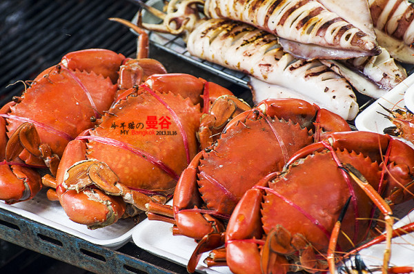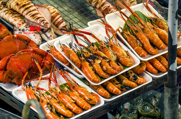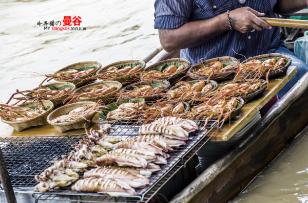 水上市场上卖的大多都是这种吃的,各种虾,螃蟹,乌贼的BBQ,价格不贵,100-200B一份