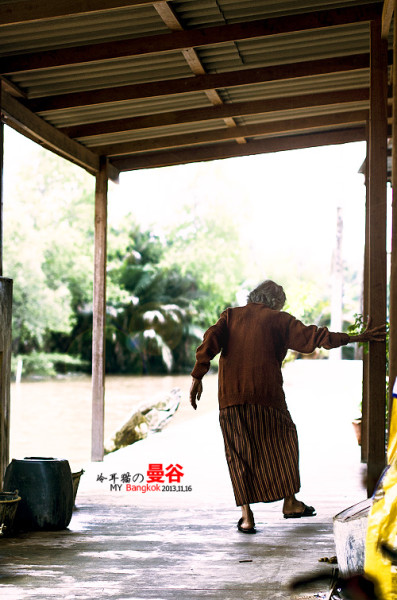 在河边偶然碰到的一位老太太的背影,看她的右手,有没有很恐怖的感觉