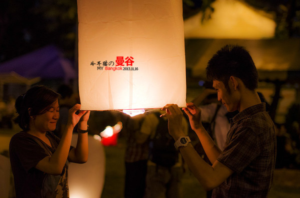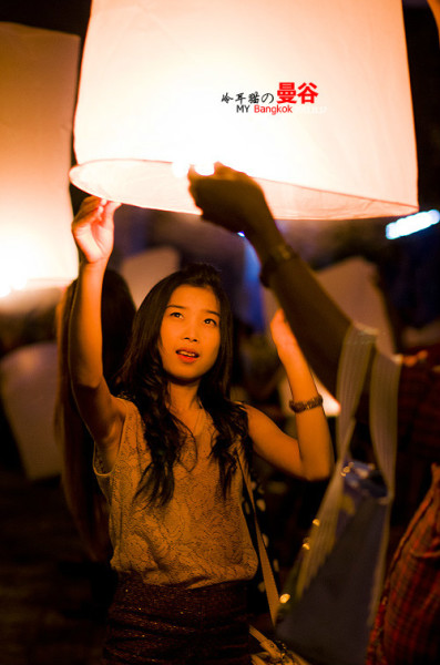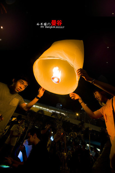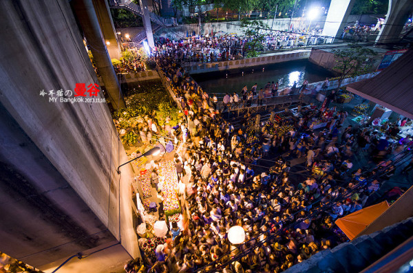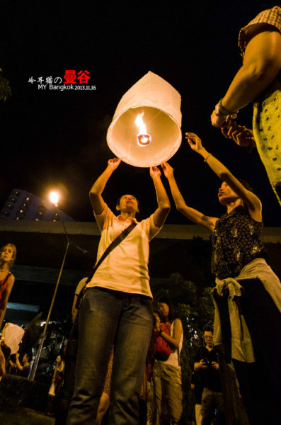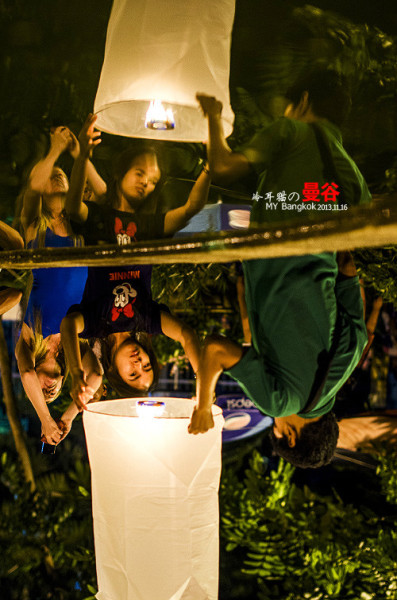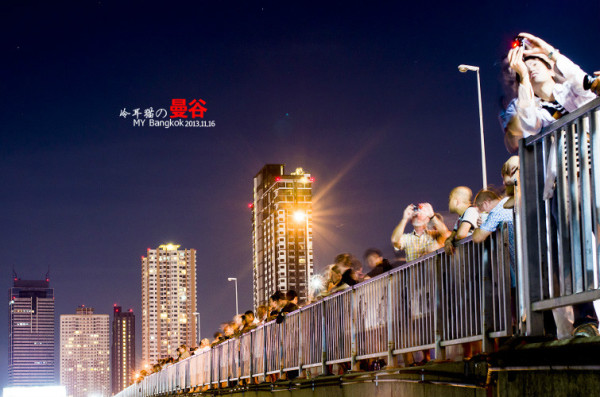 这个阵仗完全出乎我的意料,我原以为只有中国在长假和春运的时候才有这种情况,结果在曼谷同样也出现了,大家排着队坐船去摩天轮那边。人山人海啊。一时挤不进去,在桥外面的一个小广场上有很多人已经等不及去主会场了,大家堆在那儿开始放孔明灯。不过这个规模就没办法和清迈的万盏天灯两个比了。少了太多太多。
