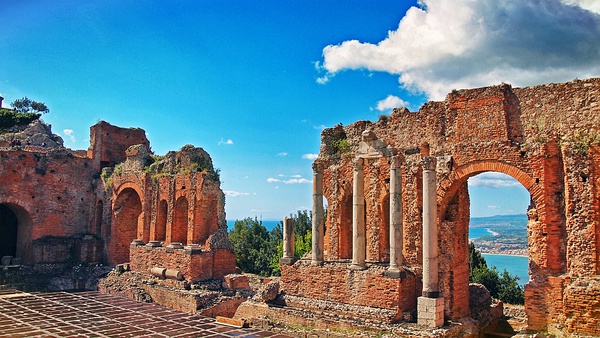 这里的希腊剧院和锡拉库萨那个一样,虽然有点破败,但仍在使用中。舞台边上甚至还有一些杂乱的布景道具。橙红色的古老剧院,像给背后湛蓝的爱奥尼亚海岸和积雪皑皑、吐着白烟的埃特纳火山这幅无与伦比的风景画镶上了一个最完美的托座。亘古的山和海,沧桑的剧院,无论少了谁,这番景色的魅力都不会那么让人屏息。