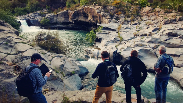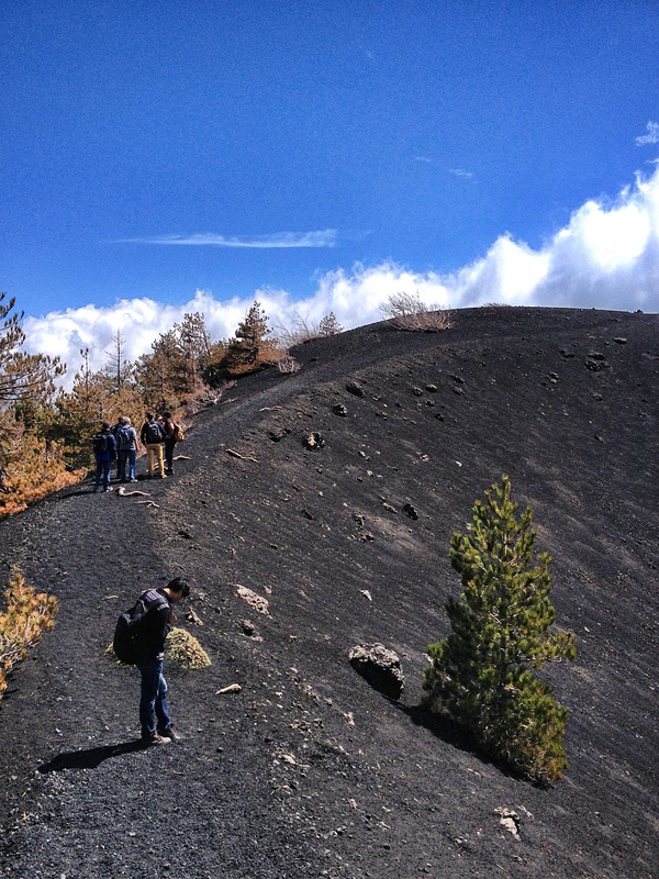 我在四川时曾经对导游有了心理阴影,但见到Fabio五分钟后他就打消了我的疑虑。和遇到的很多西西里人一样,他话很多,喜欢开开小玩笑,说起埃特纳火山就像聊起一位老朋友一样。我们驱车经过埃特纳山腰上的两个小镇,之后下车徒步穿越主峰四周的死火山群,进入火山溶洞绕回停车的地方,在一家山间小餐馆吃过午餐(很美味,毫不含糊。配的本地葡萄酒风味相当浓烈,连我这种不懂酒的都觉得不同,果然是火山水土不同)其后开车前往Alcantara河谷,中间还绕过拍摄【教父】的山间小镇。他说起埃特纳的各种地质构造形成的原因,火山灰和火山岩的种类,山上特有的动植物种群,辨别喷发危险的特征,一些诸如“山民在工业制冰技术发明前开采埃特纳山顶的积雪存放在低温溶洞里供贵族使用”的往事,他记忆里的几次强烈的喷发,海岸线上黑色沙滩的成因,还有当地人对埃特纳山的感情。