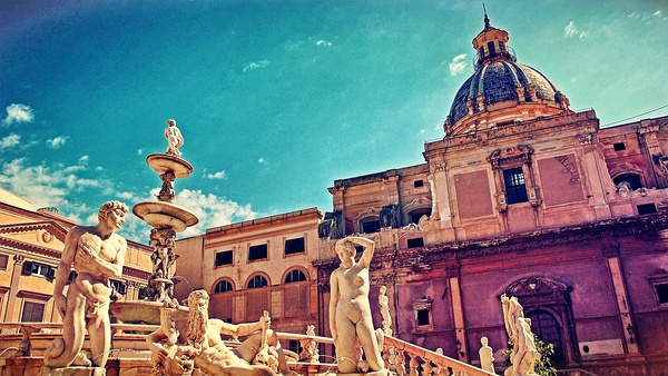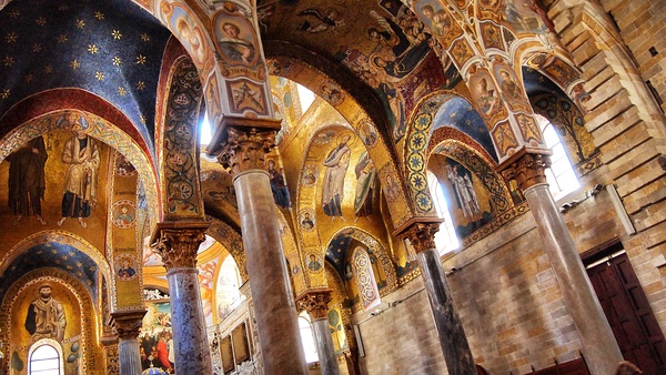对这座城市的结构记忆犹新。从恢宏的马西莫大剧院向前走到一个十字路口——四角场,便是城市的中心地标。四角场四面的弧形建筑都是一样的华丽壁饰。接着,向左是港口和海岸,向右是诺曼皇宫、新门,向前就是旧城中心。四角场向前的一小段路高潮不断——几步之后就能看见羞耻之泉,初见时的惊艳,甚至不亚于特莱维喷泉;再几步之遥,便是两个并排的教堂,一个有十分中东风情的穹顶,另一个有鎏金马赛克装饰的华丽内部。但说起鎏金马赛克装饰,还是首推诺曼皇宫里的帕拉蒂纳礼拜堂——流光溢彩、金碧辉煌已经不足以形容它的美。进入它亲眼看到那一刻,我和我朋友都呆住说不出话来。