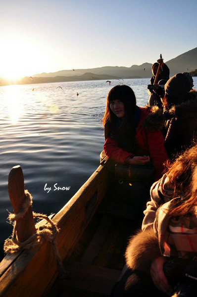 泸沽湖白天的温度很高,但早上出湖看日出就把我们仨冷惨了。