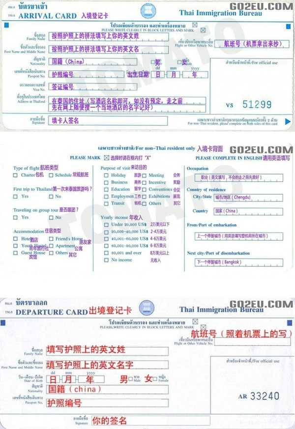 泰国入境,需要填入境单,在飞机上空姐会给发·填好就OK了··空姐还提供换泰铢的服务,不过听说汇率只有3.几···汗···入境单网上搜来的版··版··照抄: