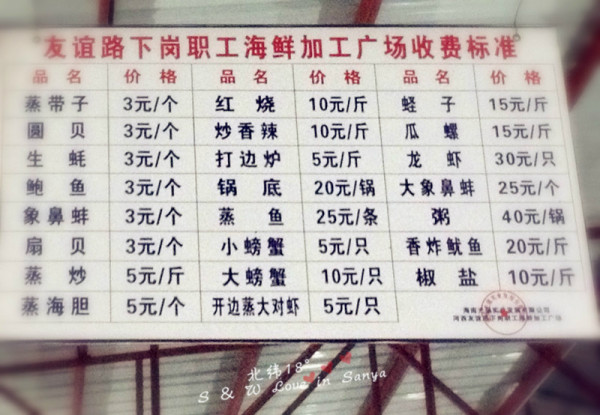 关于海鲜:扇贝:8元一斤 皮皮虾:80一斤 圣子:20一斤生蚝:10元3个 螃蟹:10元一只小芒果螺:15元2斤 大芒果螺:15元一斤鲍鱼仔:4元一只 带子:4元一只 蛤蜊:10元一斤 大龙虾:130一只。每天价格不同,稍有差异。加工费:扇贝,生蚝,带子3元一个,辣炒螃蟹20元一斤,芒果螺10元一斤。公道的加工店就是这个价格不会乱收费的。
