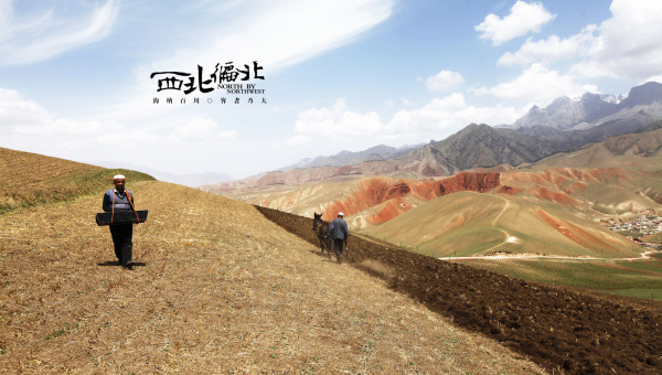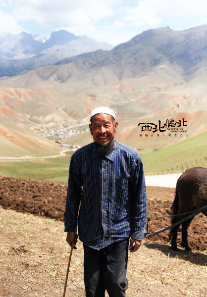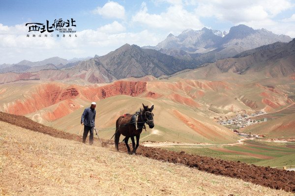 大叔在山上耕种,远方是丹霞地貌和雪山,山脚下是他居住的村落。