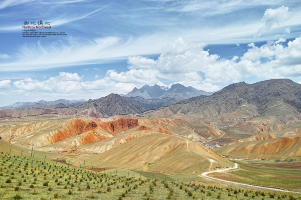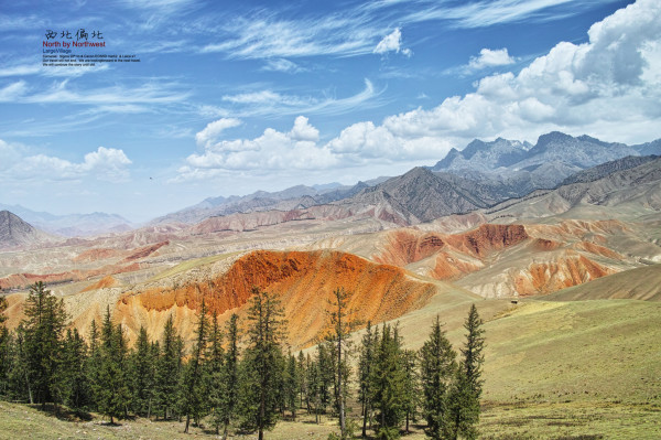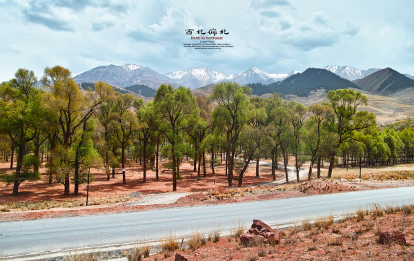 翻越祁连山的道路,红土地上的树林在雪山的映衬下,尤为俊朗挺拔