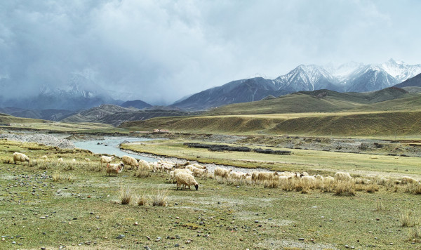 休息时走到路边,与小溪边的羊群在一起