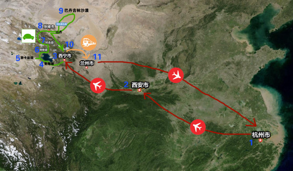 西安(陕西)-西宁-青海湖-祁连(青海)-张掖(甘肃)-阿拉善右旗(内蒙)-巴丹吉林沙漠-张掖-兰州(甘肃)
