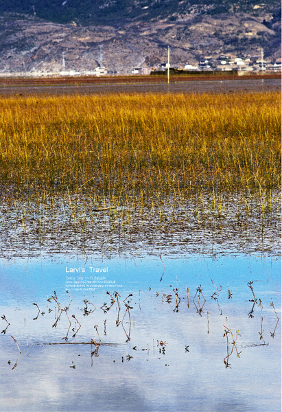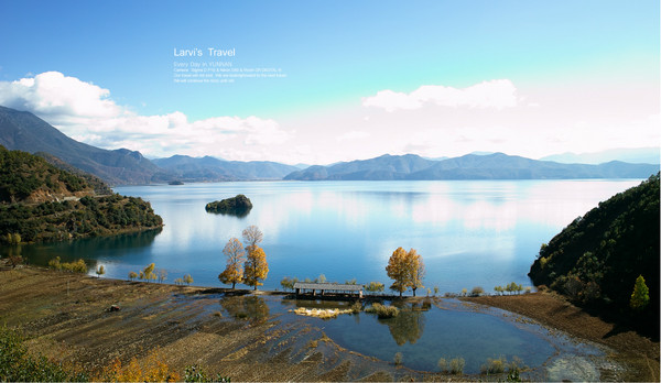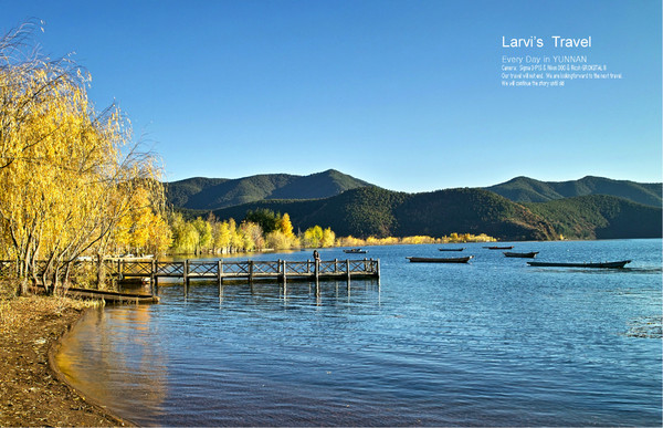 【泸沽湖--秋天的泸沽湖,颜色很漂亮,碧蓝湖水,金黄色树木,很炫目】