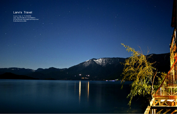 【泸沽湖-里格半岛-民宿-露台望出去的夜景,露台-湖水-雪山与星空】