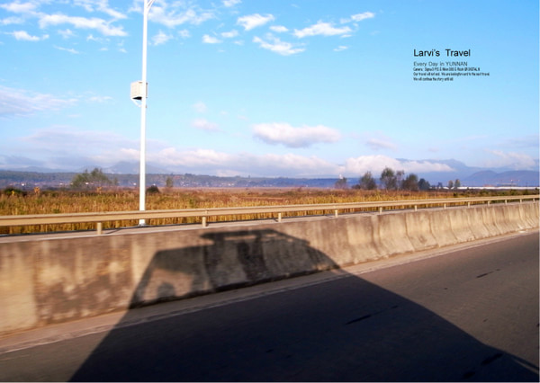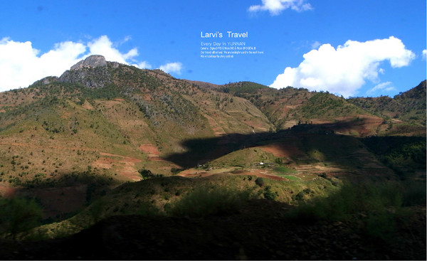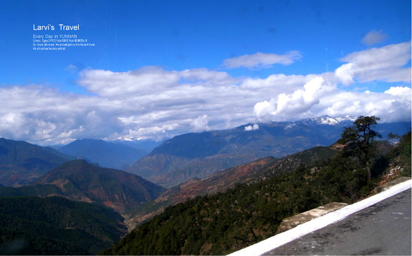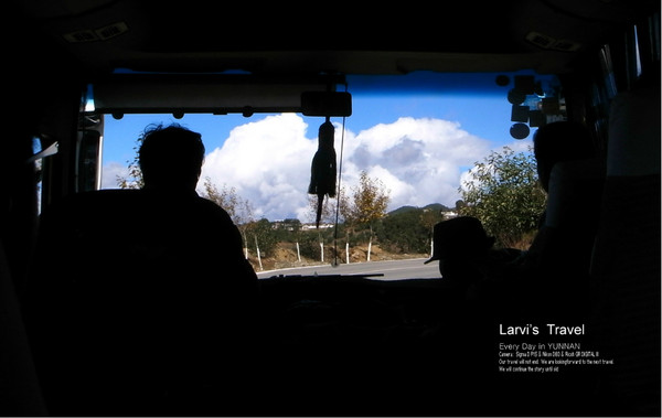 【来接机的何大姐,开着倒影中的面包车,接我们去往丽江古城,沿路景色不错,白云很低很近】
