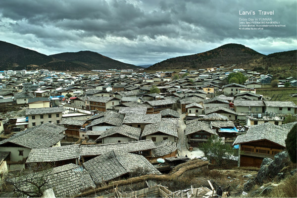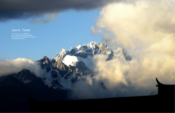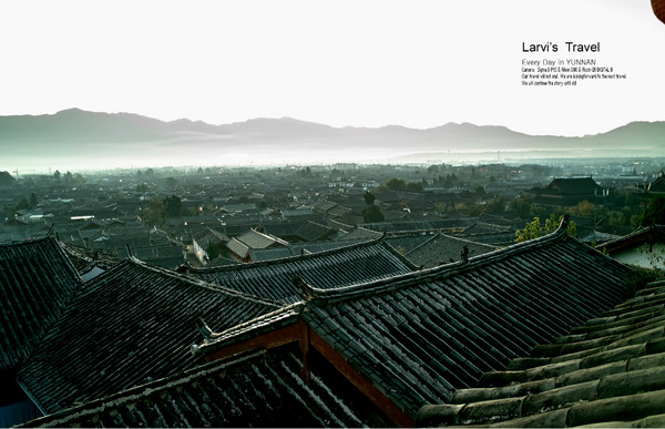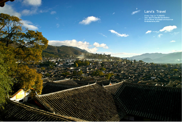 【丽江古城-从客栈露台俯视,屋顶与群山白云,非常的和谐】