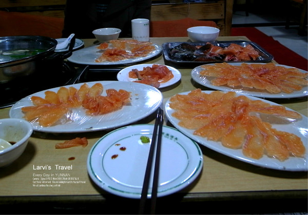 丽江的三文鱼是闻名的,向阿乐请教之后, 晚上我们去丽江城郊吃三文鱼。自己挑选,现杀,很新鲜,一大条三文鱼,切成若干盘,不同厚度,有片有肉,可以生吃也可以唰火锅,吃撑为止