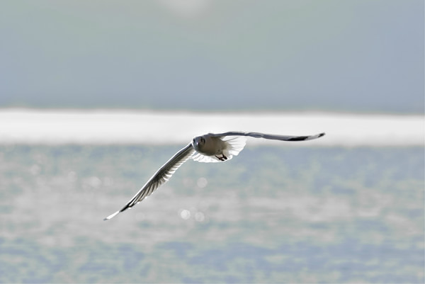 【泸沽湖上空,一群鸟儿飞过雪山】
