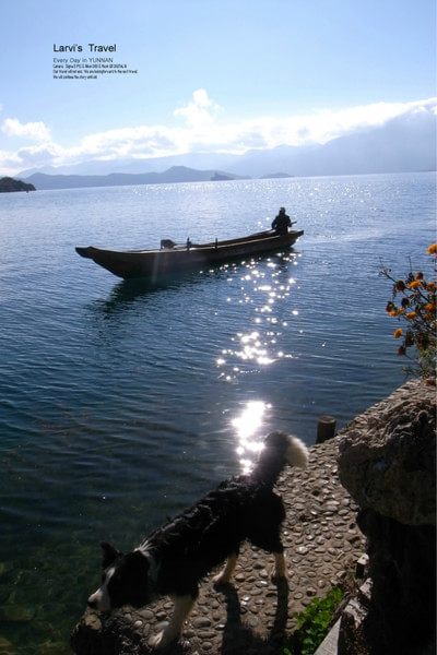 【泸沽湖畔的小船与狗--安详的氛围跃然而出,无需言语描述】