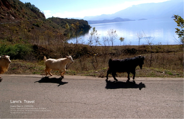 慢的程度,就是只要是个机动车都能超越我们,别说汽车,摩托车了,有时自行车都能加点速,轻松追上我们的,超车扬长而去。不过泸沽湖真的很适合如此慢节奏的游走,反正我们也不赶时间,慢慢领略泸沽湖的美。所以经常在路上,我们与牛群,羊群,鹅群一起慢慢行走,权当黑瘦哥是拉着高档黄包车带我们环湖。