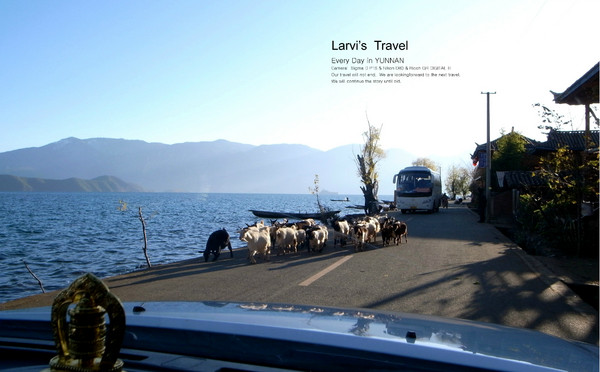 吃完了面后,“彼岸”的包车已经出发了,于是包了隔壁客栈房东的车子去环岛。隔壁房东大哥是泸沽湖的原住民,黑黑瘦瘦,话语不多,但很实诚。刚杀完猪,正空着,所以有时间带我们环湖。