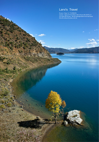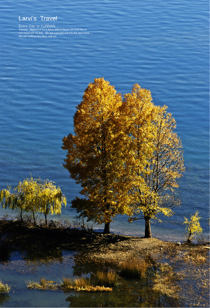 【秋日泸沽湖畔-蓝蓝的湖水,金黄的树木】