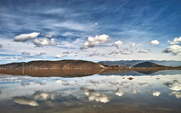 【香格里拉纳帕海,天气晴朗,白云倒影在湖中】