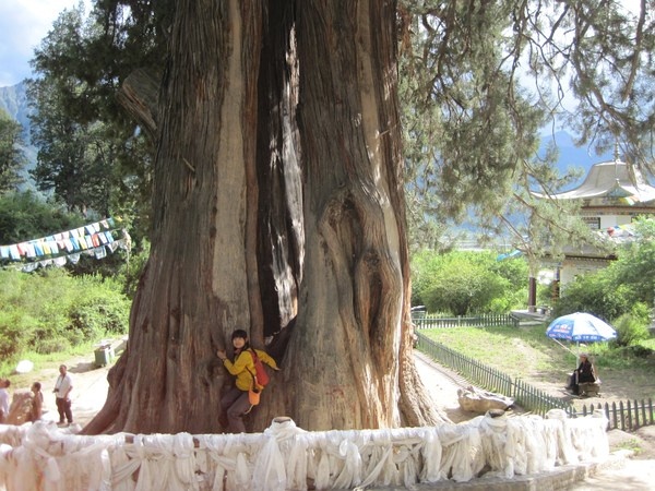 只有世界柏树王国的门票,可谓一波三折。看门的是个藏族大叔,会说汉语。首先从山脚的一条小路走,想绕到山后,差点迷路;然后企图从侧门的铁丝网钻进去,被大叔发现,失败;电视台那一套也不济事。大叔极有原则,软硬不吃。我干脆坐到大叔身边,帮他检票:“大叔一看就是个好人!有孩子吗?多大了?学英语了吧?我英语可好了,给他免费辅导下吧!……您就让我进去吧,我保证只摸一下那棵最大的就出来,只要十分钟!……我还会给你许愿,让树神保佑你长命百岁!……”