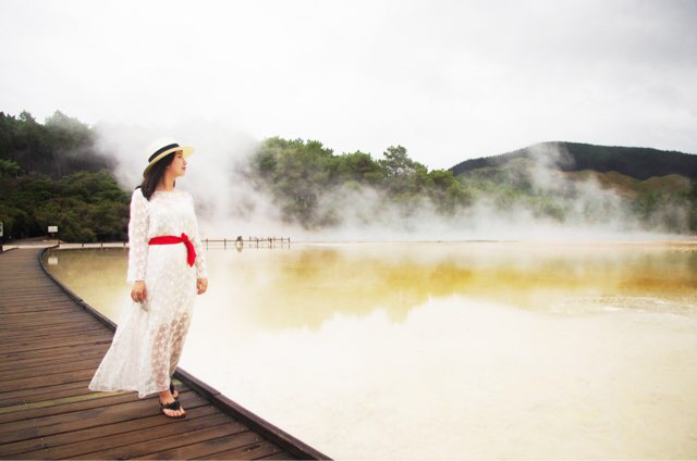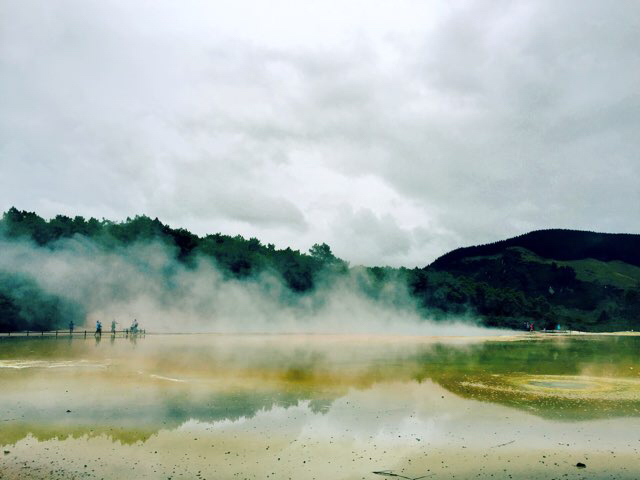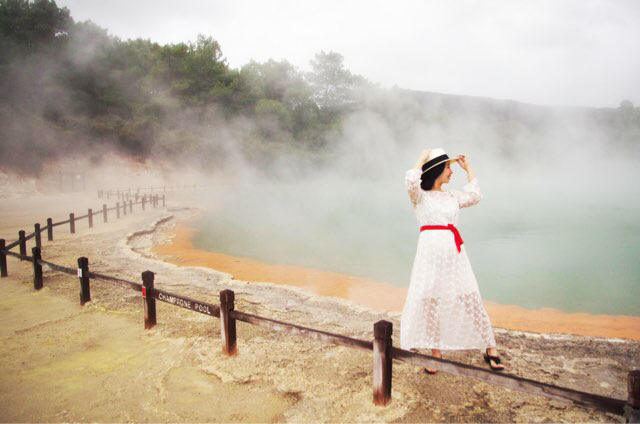 17/2 Rotorua – Taobo / 86km / 1.1h 天气太坏,最坏的时候开车能见度估计只有5米。本来想去看火山,最后也只得作罢。在怀奥塔普地热世界,心情才稍微好一些。尤其是香槟池,太让人震惊了,难怪吴奇隆和刘诗诗要选择在这边拍婚纱照啊哈哈,我也在这里拍几张!嘻嘻!阴雨天的照片很难拍出实际的美,来新西兰的朋友不容错过的一站。