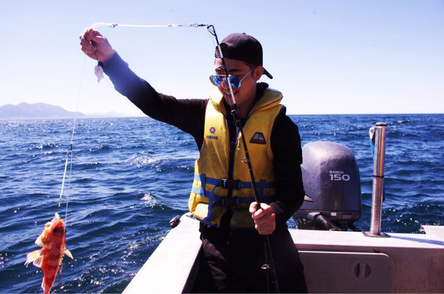 20/2 Kaikoura 在毛利语中,凯库拉(Kaikoura)的意思为龙虾大餐。Kai的意思是食物,koura的意思是龙虾!所以这里就是新西兰的龙虾之都啦!比起去餐厅点个龙虾吃一吃,跟随当地人出海捕一次龙虾才是明智选择! 捕龙虾的饵和笼子放好之后,先出发海钓。海水深95米,鱼超多。感觉线刚放下去就已经有鱼咬钩,拉上来看,两条!捕龙虾的时候,笼子里还捕到了一条女生手臂长的小鲨鱼,龇牙咧嘴凶得很,把它放掉了。 凯库拉当地对出海捕渔有严格要求,所有的鱼必须符合规定尺寸才允许带回,否则就得放归大海。龙虾则是雄的符合标准才准带回,雌的必须全部放归。 战果是五条鱼,一只下!满载而归途中还看到海豚!一共六只,排成一排,超级可爱。