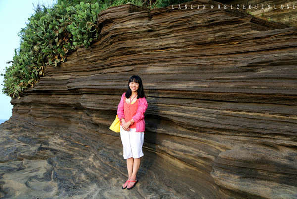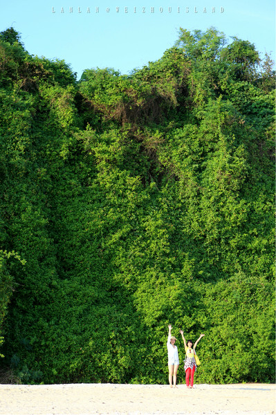 往滴水丹屏去的沙滩旁,火山熔岩上长出来的植物绿油油,近看发现是七色花,一大片一大片的绿色点缀着七色花,我们又奔过去了。