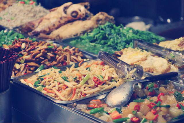 一家小摊,像居酒屋一样,食客坐下,自己看着点菜,老板盛饭盛菜递给你~