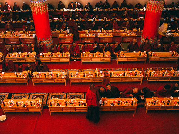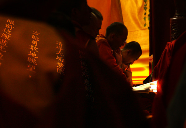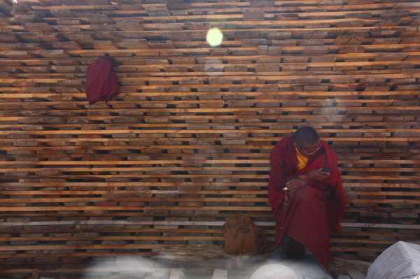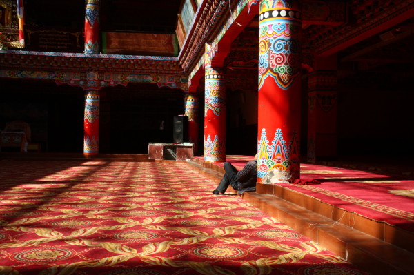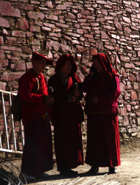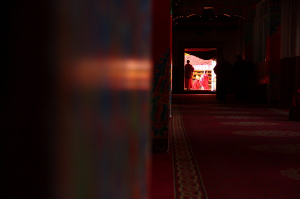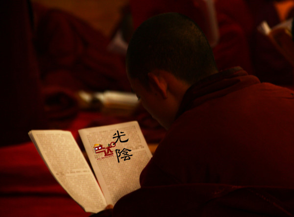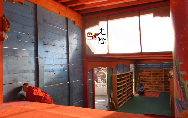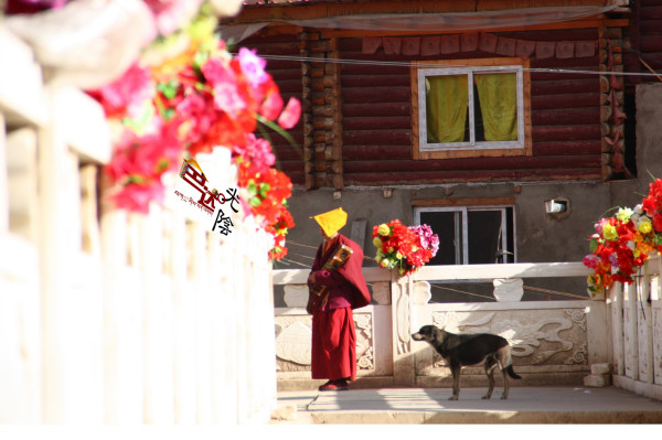 我爬上台阶的最高处,又累又饿,一屁股做在门前,几乎站不起来。刚好这时候佛学院的课程结束,三五成群的喇嘛身披阳光,沿街而下。