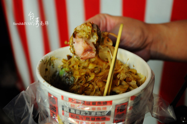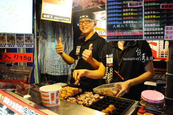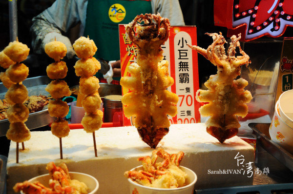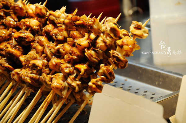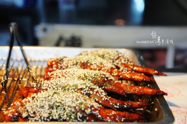 把鸡翅中间塞满炒饭,再在表面涂抹油和酱料烤制,再撒上芝麻和其他调料,金黄泛油,让人食欲大增。 没走几步还有一家卖花枝烧的,也很好吃!