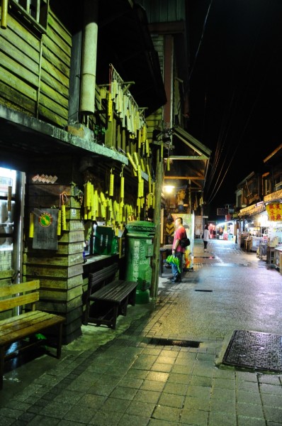 这一整天,都断断续续地下着雨。夜幕降临,泛黄的灯光映着湿漉漉的地面,氤氲着一层朦胧的湿气,木质建筑散发出的怀旧气息,整个画面有点日式。可惜照片拍糊了。