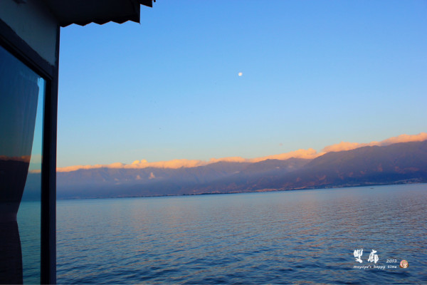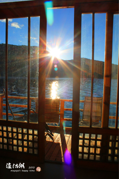 泸沽湖的蚊虫很多,千万不能开灯开窗户或是门啊!第二天一早6点就自然醒了,躺在床上一睁开眼睛就能看到这样的景色,真是神仙般的享受啊!