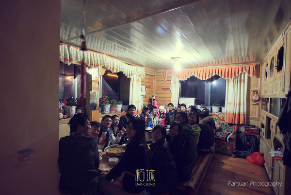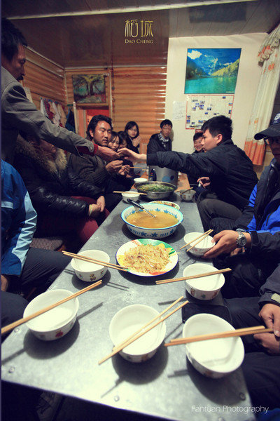 回来的时候一路全是下坡,因为回三哥家的路海拔再下降,加上高原的自然风,你根本不需要骑,坐上车就感受60迈的速度吧。那种感觉真的很爽,根本不需要你蹬,我就是一路这么被下回来的。回到三哥家天色已经很晚,大家都等着吃饭,过去一看吓死了一堆人,这几天从来没有这么热闹。都是从亚丁回来的驴友,这么多次旅行还真的没有遇到过这种吃饭的场面,和来之不同地方的人还有不认识的驴友一起共,。还是多了一份尴尬跟温暖。为了记录这一瞬间,我们用广角记录了这要饭的瞬间。