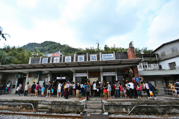小火车缓缓开进十分站时,窗外店家有个带着大头娃娃面具的人正朝着车厢挥舞双手,这个有些奇幻色彩的画面一下子把我带进了某个电影或者偶像剧的情景。