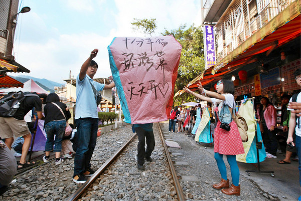 所以当我沿着铁轨走,看见周末凑热闹放天灯的人群里,盼望爱情的女孩,在天灯上画图的小朋友,害羞牵手的小情侣,温馨的一家三口,都好像是在一个电影背景里穿梭,每个人都是自己故事的主角,诉求愿望的升空。
