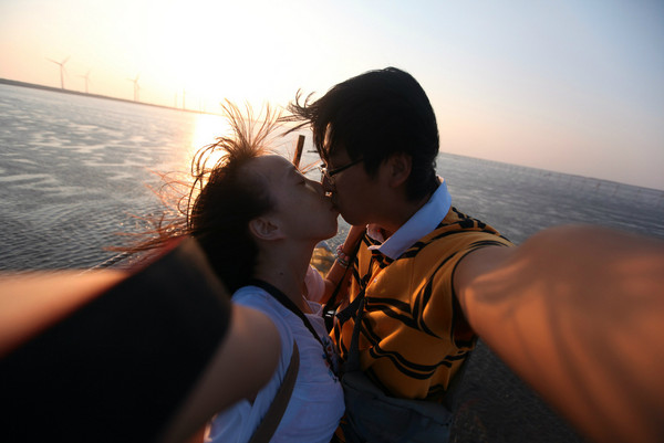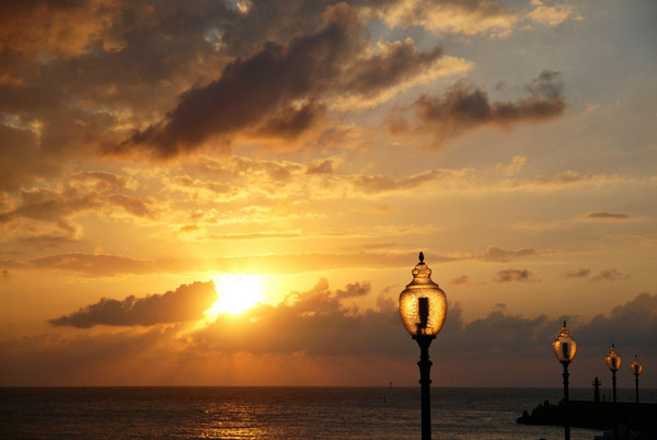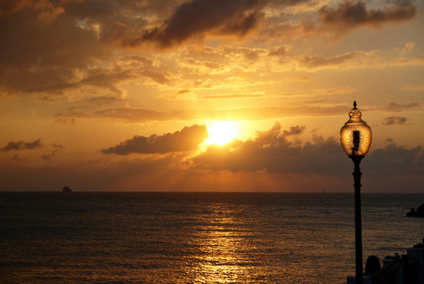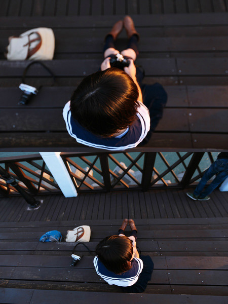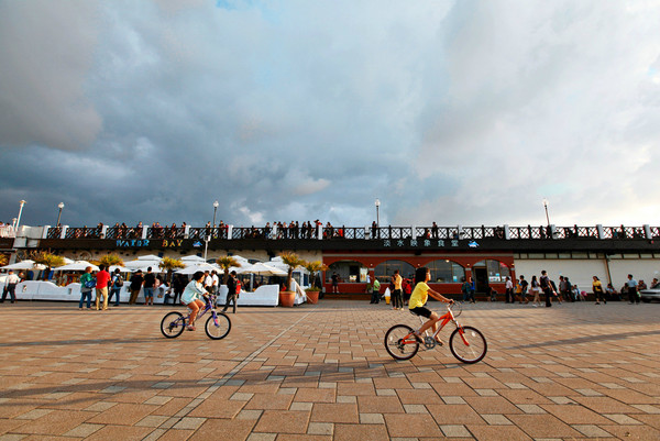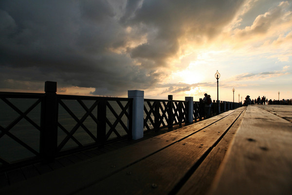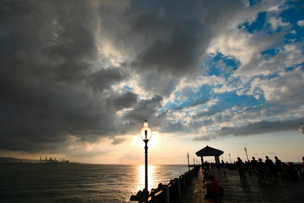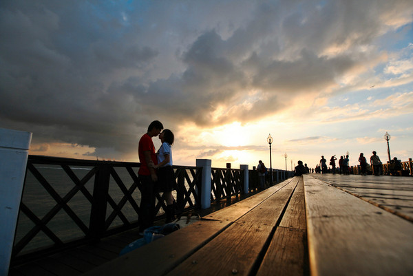 正值周末的码头非常热闹,人们或三五成群地坐在码头的步道上等待日落,或在路边的卖艺摊头观看,或在夕阳下追逐嬉闹,或静静地发个小呆。