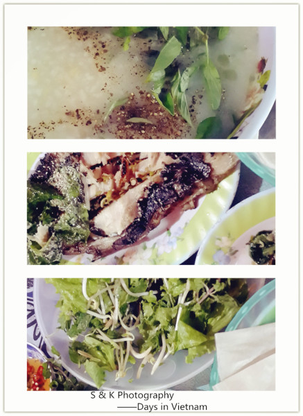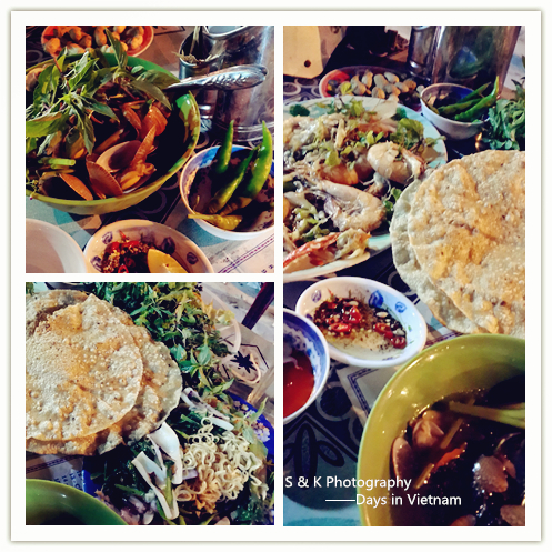 速速买完单,折合300RMB左右,Ken又载着我回到昨天的海鲜小排档那儿,花甲烤鱼炒面又点了一堆,虽然没吃完但吃的很开心。烤鱼是老板娘推荐的,烤了好一会,鱼没有刺,肉很韧口感很不错,不过吃法有些奇怪,跟北京烤鸭似的要裹上面皮沾上酱,酱的味道比较奇怪,老板娘还很热心的教我们怎么吃。第二次去的时候,店里的人几乎都认识我们了,见我们来就都远远的笑着,我想,这就是岘港人最淳朴的样子了吧。