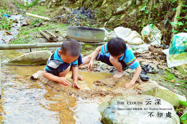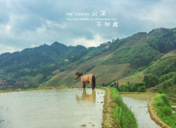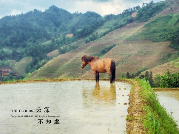 正攀爬当中,突然一匹马从上面的台阶跑下来,为了躲避我们拐到旁边梯田的水洼中去,行云天地间,真是神来之笔啊~只可惜Iphone拉远后像素太渣。。。