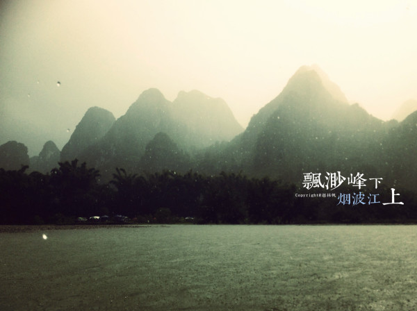 船愈行,雨俞紧,后来岂止是“烟雨漓江”,简直是暴雨,大珠小珠落玉盘,靠在船侧的衣袖也被淋了个透。怕相机沾水,只好收起,没能记录这暴雨之下的壮景。