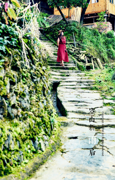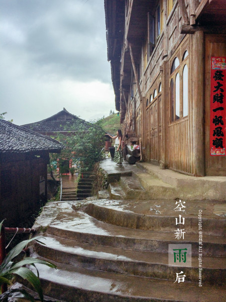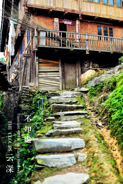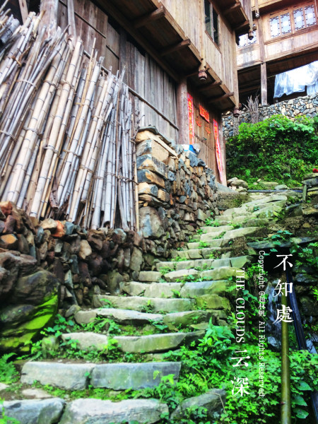 百米高山,全靠凿出的窄窄石阶开路,下雨天不免路滑,拉着行李的确难以行走。当我们爬的上起步接下气,阿婆抛来善意的微笑:马上就到,坚持一下!年轻人的体力还比不上60岁的老人,真是汗颜!