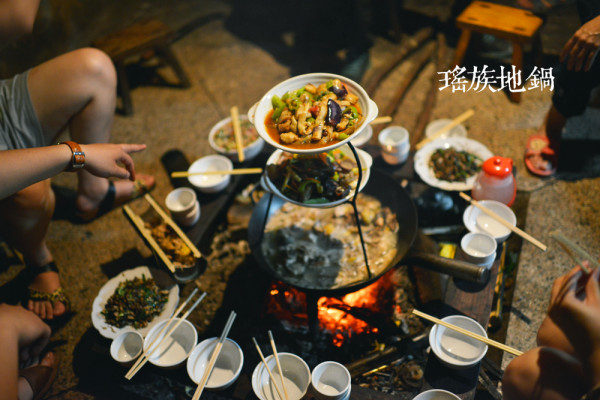 回到客栈,天色已暮。一人凑了35元钱,和当地的瑶族人一起吃地锅。架子的形式很独特,中间是火堆,第一层是炖鸡,蒸汽又把二三层的盘子加热,使食物始终保持温度。最底层的架子又可以放米饭、菜肴和酒。她们自酿的米酒十分醇厚,喝起来又不会上头,就算有醉意也不会头疼恶心。一家人围坐篝火旁,热气腾腾吃上一顿,实在暖心。