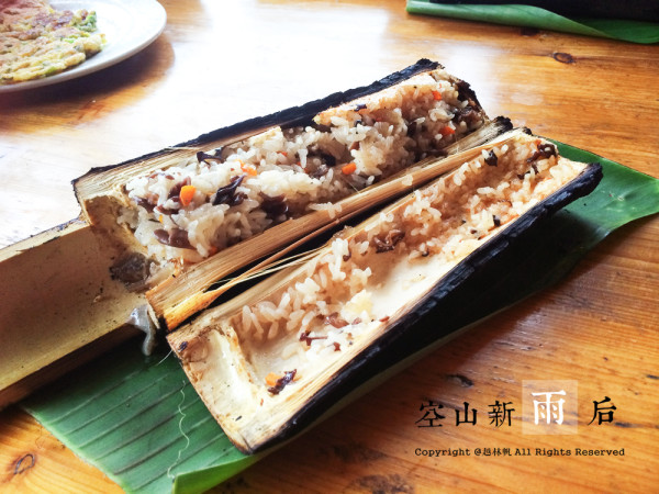 一上午风急雨紧,倚楼漫听,不觉时光漫。中午享用瑶族人的竹筒饭,第一次见到竹筒饭是如何烤制而成。竹子就从山里中劈来,腊肉是当地的特色,伴着糯米一起倒入竹筒,放在地锅的柴火堆中,缕缕青烟伴着噼啪声,制作还是相当麻烦的。