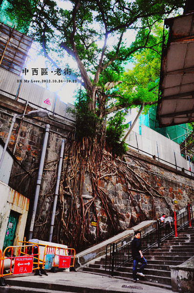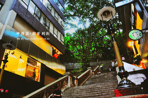 走到都爹利天色已暮,在置地广场附近,闹市区中安静的小街道,特色是4支煤气灯,属全港仅余,历史悠久,为法定古迹。听闻有许多港人喜欢在次拍婚纱。没有爬高,只是坐在台阶上歇歇脚,背后是大榕树。
